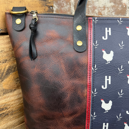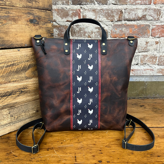 This backpack features our original JH print leather with the JH logo, chicken silhouette with bandana, and wheat pattern. Check out the matching wallet here!
