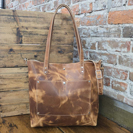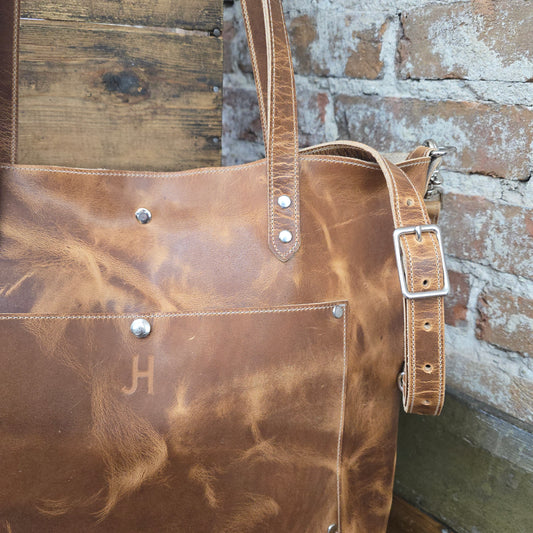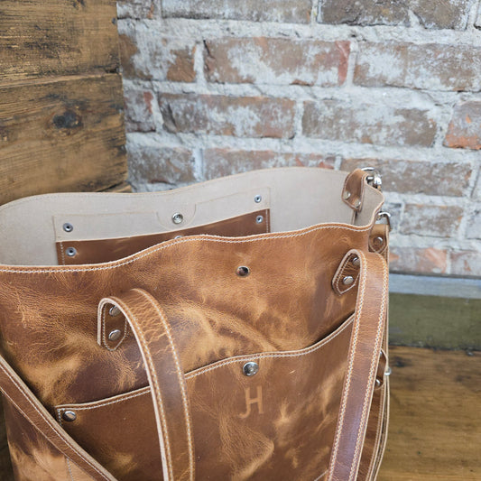 The Tote Bag is the bag that ends all tote bags. It smells as good as it looks! This leather is luxurious, rugged, and just stunning. It is paired with soft straps made from premium leather. The Tote Bag is perfect for an everyday carry bag or as a laptop/work bag.