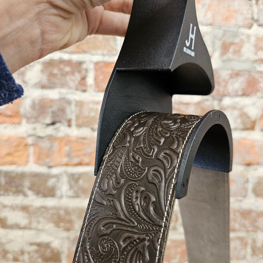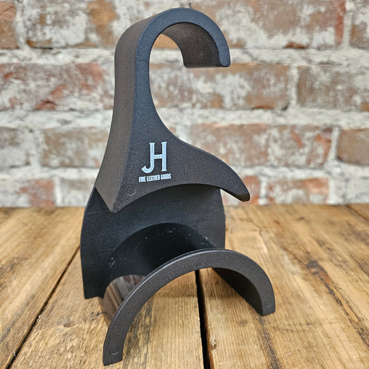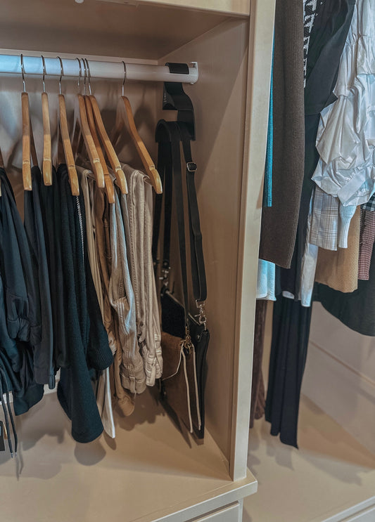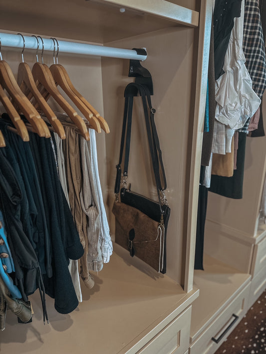 The JH Bag Hanger is the perfect way to organize your collection of handbags and clutches. Its unique patent pending design can securely hold multiple wristlets in addition to larger bags. It can accommodate thin or wide straps without creating bends or wrinkles in the leather. Unlike other styles of hangers, it easily fits over most closet rods, making your closet look neat while staying functional and organized.