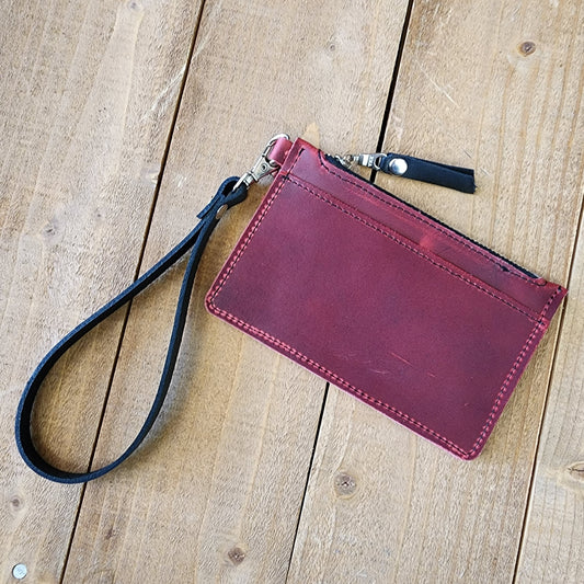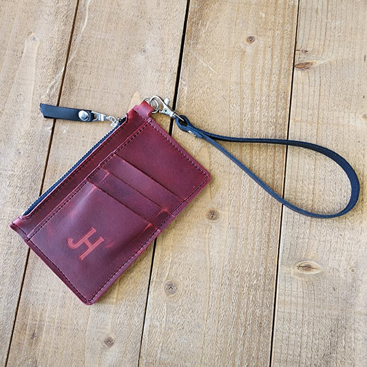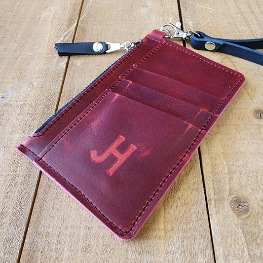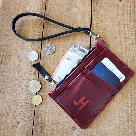 The Modesto Clutch is an elegant, slim wallet made with full grain leather. It features card slots and a secure zipper pocket for cash, ideal for a night out. The included wristlet strap brings extra portability, while the full grain leather gives it a timeless look.
